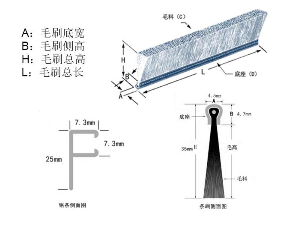 工業(yè)門(mén)、卷簾門(mén)、快速門(mén)一般使用H型(180°)或者F型(90°)鋁條配套毛刷,毛刷的高度常用規格是35mm,50mm,100mm,毛料有PP,PA。